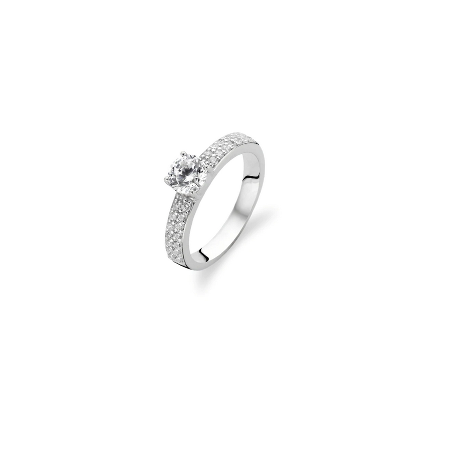 Este elegante anel TI SENTO - Milano consiste em um anel de prata de rodío sterling coberto com duas fileiras de zircônias cúbicas pavé set. O cristal grande, corte redondo, é brilhante em um cenário clássico de chaton. O interior está muito bem acabado para oferecer alto conforto. É uma boa ideia combinar o anel com diferentes joias da coleção TI SENTO.