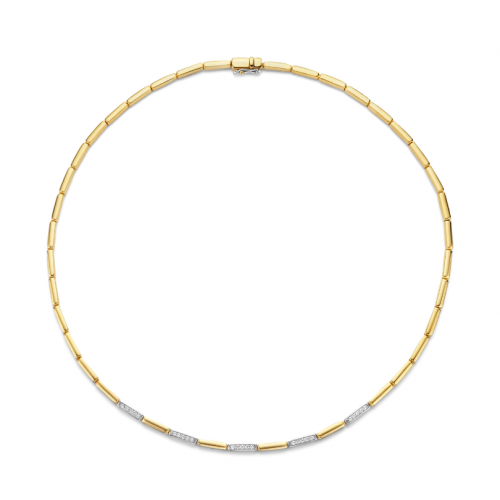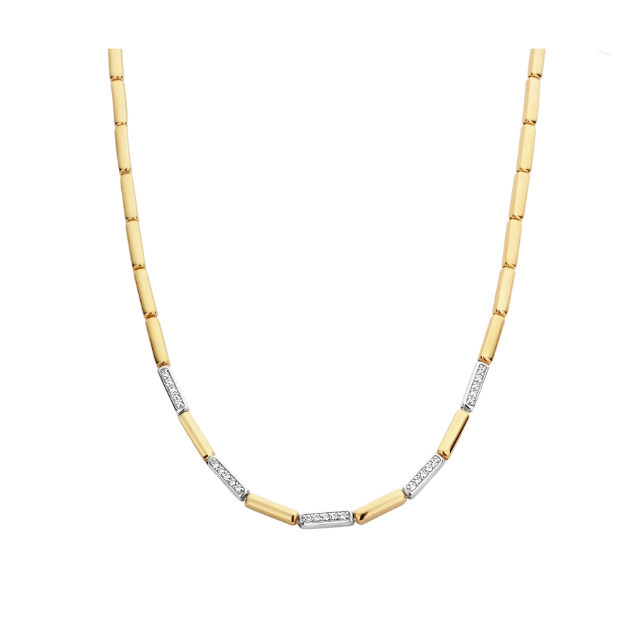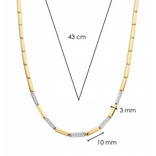 Este TI SENTO - Colar de prata banhado a ouro milano 3997ZY/42 ostenta um fluxo de alternados segmentos de prata esterlina e banhados a ouro. O colar é feito a partir de 925 prata esterlina e banhado com ouro amarelo de 18k. Decore seu decote com esta sofisticada peça de declaração. O colar tem 42 cm de comprimento e seu comprimento não é ajustável.