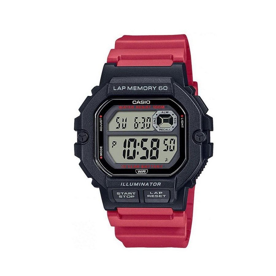 Relógio Casio Collection WS-1400H-4AVEF. Este relógio Casio Collection tem uma caixa com diâmetro aproximado de 46 mm, cor preta e bracelete cor vermelha. Está equipado com um movimento digital. O relógio é estanque até 100 m | 10 bar | 10 atm. Composição: resina.