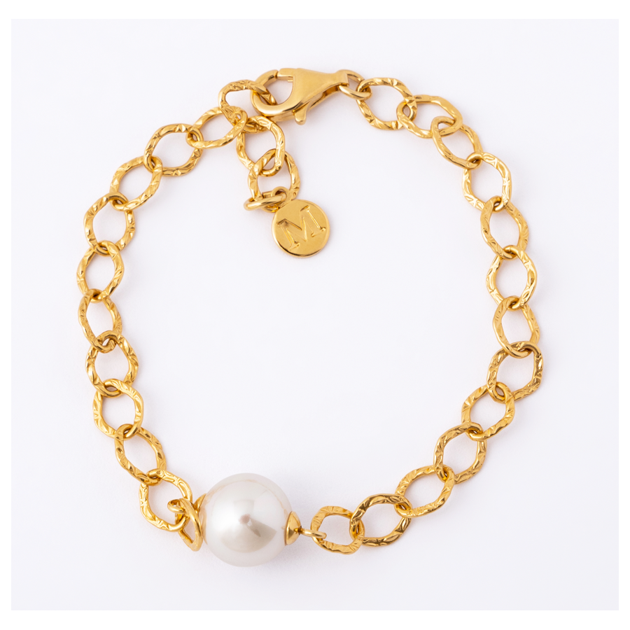 Pulseira de pérolas Aina com pérolas orgânicas de 8mm produzidas na ilha de Maiorca. Prata de lei 925 dourada com banho de ródio. Tamanho 21 cm.