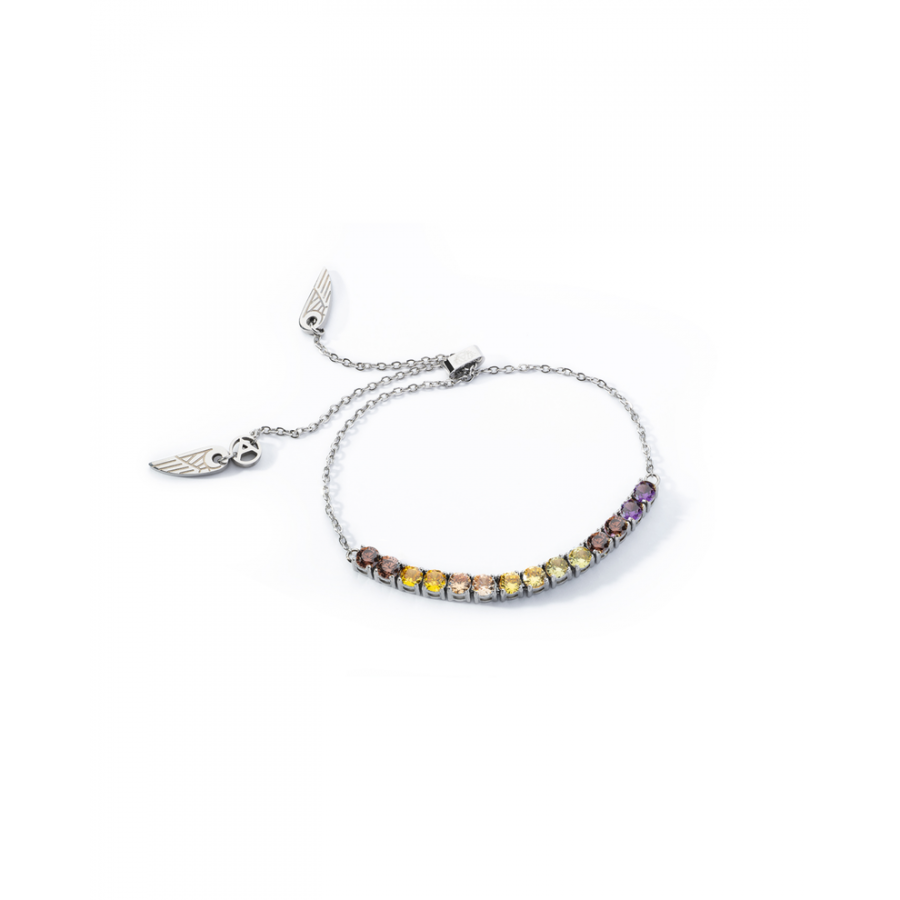 Pulseira Lost In You de aço hipoalergénico dourada com cristais multicolores. Esta peça tem o elemento característico Anjewels, as asas com fecho ajustável. Esta pulseira é para todas as mulheres que se amam e acreditam que o amor é o melhor caminho para o sucesso.