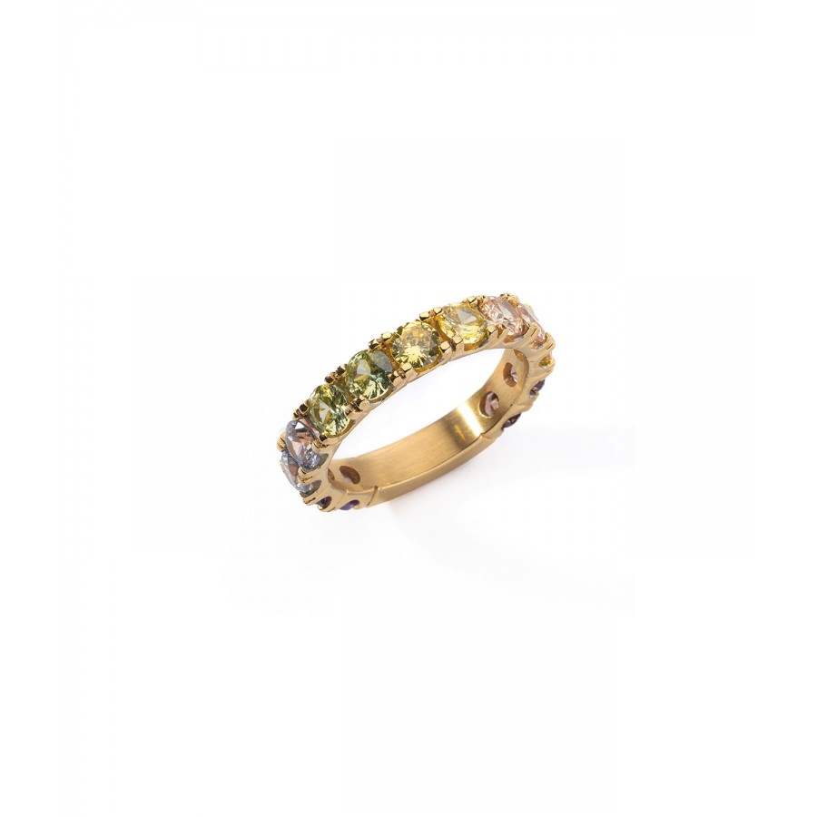Anel Lost In You de aço hipoalergénico, dourado com cristais multicolor. É uma peça para todas as mulheres com garra e prontas para atravessar qualquer adversidade. É o anel das mulheres que tem dentro do coração paz e amor próprio.
