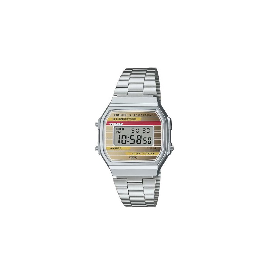 A Casio faz renascer este design icónico na forma de relógio, dando o toque original dos anos 80 ao sempre popular A168, ao utilizar as cores retro de base em preto e dourado da SL-800 e até as mesmas cores de destaque utilizadas para os números de apresentação das horas e outros detalhes.