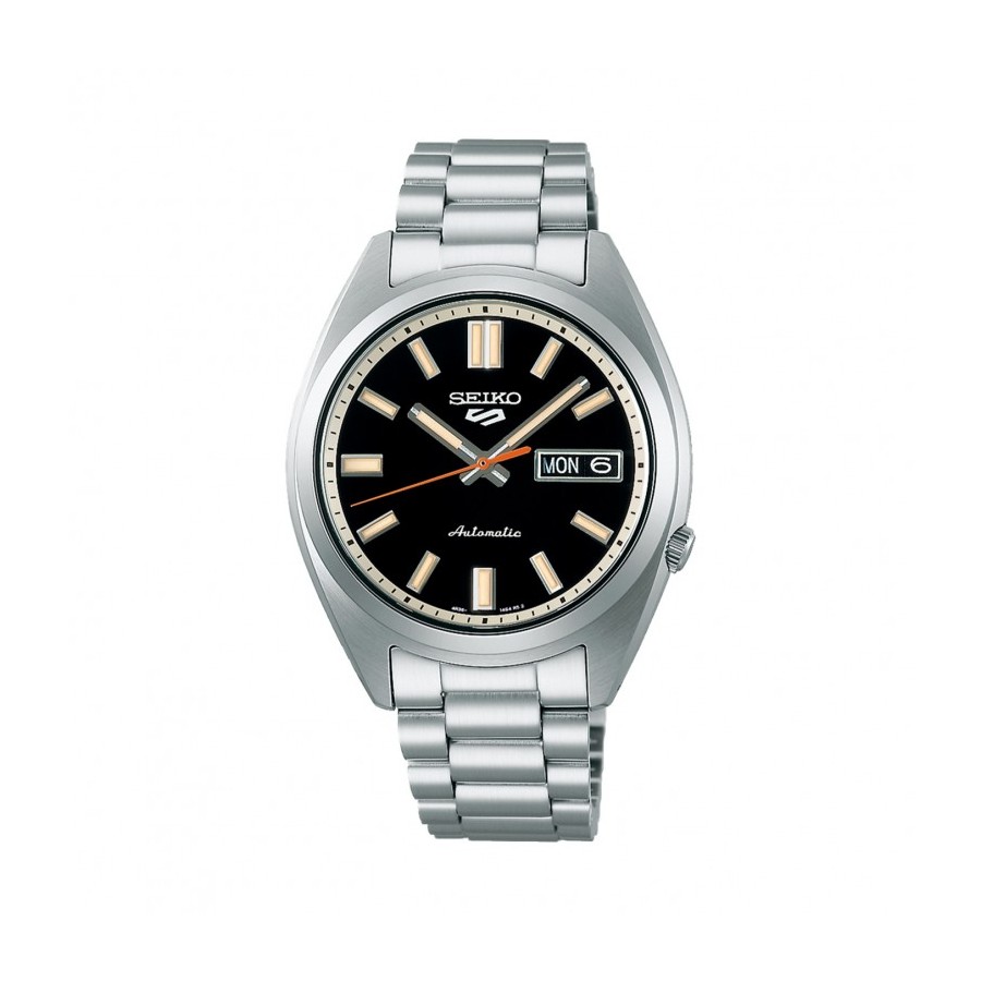 Relógio masculino de movimento automático da Seiko 5 Sports Style, elaborado em aço inoxidável com um design que garante conforto para uma utilização visual diária. Com a sua combinação de elementos modernos com clássicos, presentes no mostrador preto e ponteiros em laranja e apontamentos dourados, de referência aos anos 1970, um toque de nostalgia do mundo da relojoaria é evocado como uma evolução ou uma novidade elegante, colorida e refinada.