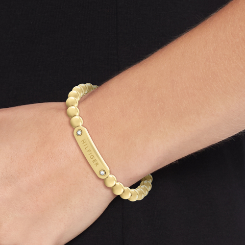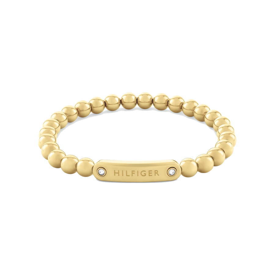 Pulseira com contas para mulher, adornada com cristais, um sofisticado acabamento em dourado e as icónicas riscas Tommy Hilfiger no centro. Criada para a mulher moderna que valoriza tanto a sofisticação como o estilo, esta pulseira emana glamour. O diâmetro desta pulseira ajustável, com 165 mm, e o fecho elástico, garantem um ajuste confortável, enquanto as contas e o detalhe do logótipo icónico dão um toque único.