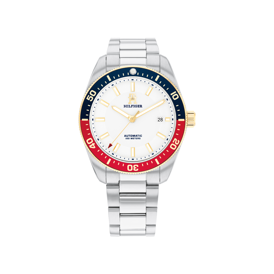 TH85 Automático, o novo relógio icónico Tommy para ele, fabricado em aço inoxidável, apresenta uma caixa de 40 mm resistente à água até 100 metros (10ATM) e possui uma luneta rotativa em alumínio com rebordo em forma de moeda e aplicações luminescentes. O verso da caixa de exposição expõe o movimento automático japonês de alta qualidade, oferecendo um look Sport Lux. O mostrador tem um acabamento brilhante, uma janela de data às 3 horas, índices facetados aplicados e apresenta o logótipo monograma TH . Disponível em braceletes de 3 elos em aço inoxidável ou pele, e em tom dourado com coroa de rosca gravada com o monograma Tommy Hilfiger.