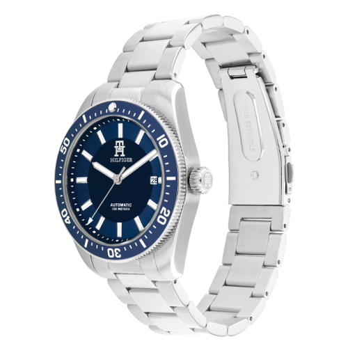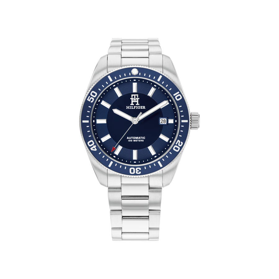 TH85 Automático, o novo relógio icónico Tommy para ele, fabricado em aço inoxidável, apresenta uma caixa de 40 mm resistente à água até 100 metros (10ATM) e possui uma luneta rotativa em alumínio com rebordo em forma de moeda e aplicações luminescentes. O verso da caixa de exposição expõe o movimento automático japonês de alta qualidade, oferecendo um look Sport Lux. O mostrador tem um acabamento brilhante, uma janela de data às 3 horas, índices facetados aplicados e apresenta o logótipo monograma TH . Disponível em braceletes de 3 elos em aço inoxidável ou pele, e em tom dourado com coroa de rosca gravada com o monograma Tommy Hilfiger.