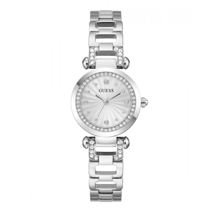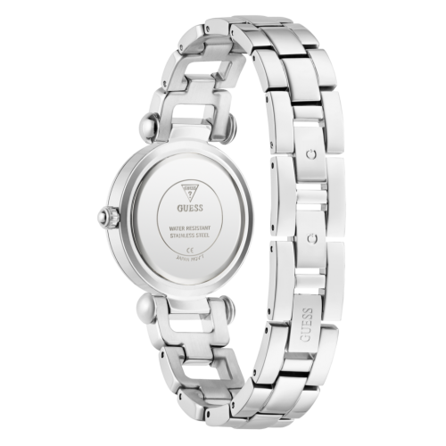 O relógio Guess GW0869L3 é uma expressão de delicadeza e sofisticação. Feito em aço inoxidável prateado, apresenta cristais brilhantes decorando o aro, o mostrador e os detalhes da pulseira, proporcionando um visual elegante e glamouroso. O mostrador prateado com textura radiante e marcadores sutis reflete um estilo refinado, ideal para mulheres que valorizam acessórios clássicos e versáteis.
