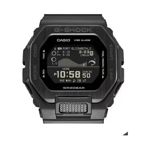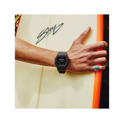 Vá para as ondas com o relógio com ligação a smartphone GBX-100, inspirado nas cores naturais da praia. Da linha desportiva G-LIDE para os melhores surfistas e fãs de desportos radicais do mundo. Basta selecionar um dos 3300 locais de surf em todo o mundo na aplicação para smartphone dedicada e enviar padrões de marés, condições de luz do dia e outras informações específicas da localização para o relógio. O enorme mostrador do relógio com LCD de MIP (Memory in Pixel) de alta resolução fornece as mesmas leituras claras dos gráficos das marés e da fase da lua que os modelos anteriores, bem como os níveis e as horas das marés altas/baixas e as horas do nascer do sol/pôr do sol tudo num relance. Os surfistas que competem em competições difíceis em todo o mundo apreciam a funcionalidade de treino e surf. O GBX-100 monitoriza a distância percorrida, o ritmo, as voltas e a cadência, bem como uma gama completa de métricas de surf, todas fornecidas diretamente no seu pulso. O aro, uma fusão de resina e metal, foi concebido para distinção. O contraste entre os acabamentos polidos e escovados no aro superior em aço inoxidável dá o toque final a um relógio desportivo que oferece resistência e um aspeto elegante. Tendo em mente os ambientes instáveis, o relógio apresenta uma estrutura de proteção em resina para suportar impactos de cima, de baixo e de ambos os lados, bem como uma estrutura de proteção para o botão na posição das 6 horas, para proporcionar toda a resistência ao choque que se espera de um G-SHOCK. A bracelete é fabricada em uretano biológico macio com uma abertura na base da posição das 6 horas, para um melhor ajuste e para o escoamento da água e do suor, o que permite uma utilização confortável para que se possa concentrar nas ondas