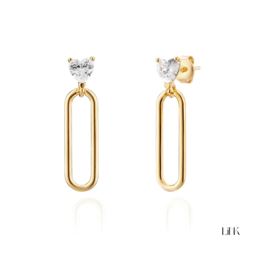 Delicadeza e modernidade unem-se nestes brincos da Link, que combinam uma zircónia lapidada em forma de coração com um pendente geométrico ovalado em banho de ouro. A estrutura minimalista e elegante transmite sofisticação com um toque romântico, ideal para quem aprecia peças discretas, mas com personalidade. Uma escolha versátil que pode complementar tanto produções casuais quanto looks mais elaborados.