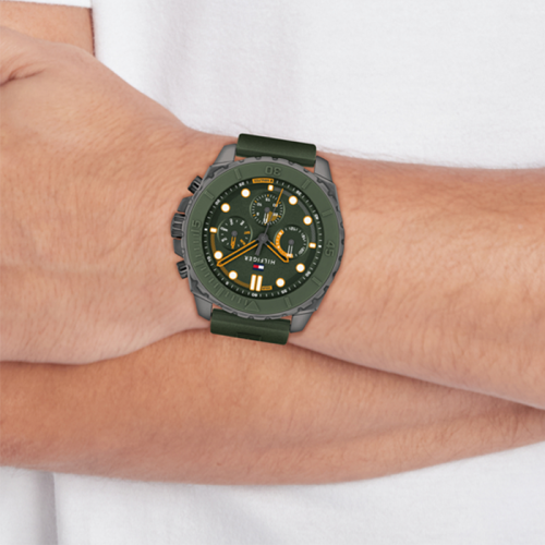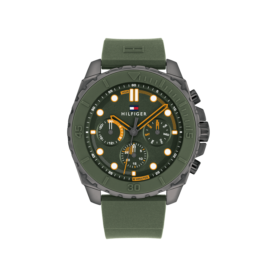 A Tommy Hilfiger combina a grandeza e a robustez num só relógio multifunções para homem. Com braceletes em silicone azul, uma luneta desportiva em silicone e uma caixa de grande dimensão, apresenta um mostrador em grão mate com índices redondos e ousados, além dos apontamentos de cor para dar um toque adicional.