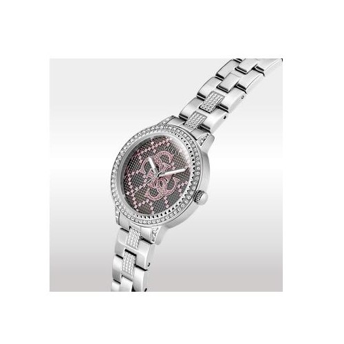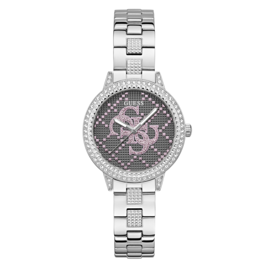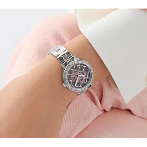 Elegância e brilho em cada detalhe! Com bracelete em aço prateado, aro cravejado de cristais e mostrador preto texturizado com logótipo rosa cintilante, este relógio Guess é o acessório ideal para destacar o seu estilo.
