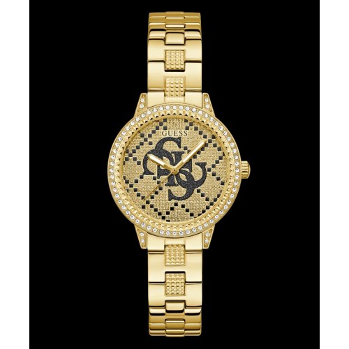 Luxo e sofisticação em um só acessório! Com bracelete em aço dourado, aro cravejado de cristais e mostrador dourado texturizado com logótipo preto, este relógio Guess é perfeito para quem gosta de brilhar em qualquer ocasião.