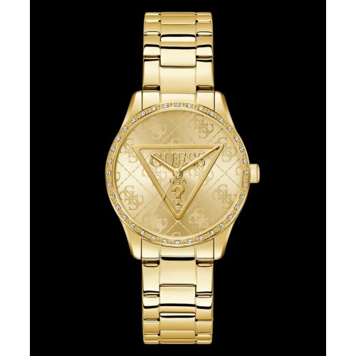 O Guess GW0987L2 é um relógio feminino sofisticado que combina luxo e modernidade. O design totalmente dourado em aço inoxidável transmite elegância, enquanto o aro cravejado de cristais adiciona brilho e glamour. O mostrador dourado texturizado, com o icónico logótipo da marca em preto, realça a identidade ousada e estilosa da Guess. Um acessório perfeito para completar qualquer look com requinte.