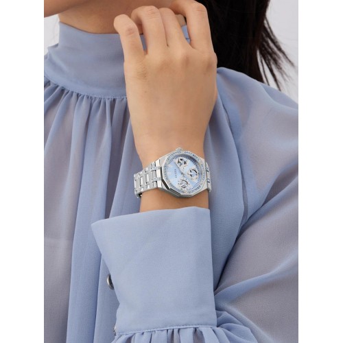 Mostrador: Mostrador analógico em tom azul claro (ice blue), com detalhes em cristais que acrescentam brilho ao visual.