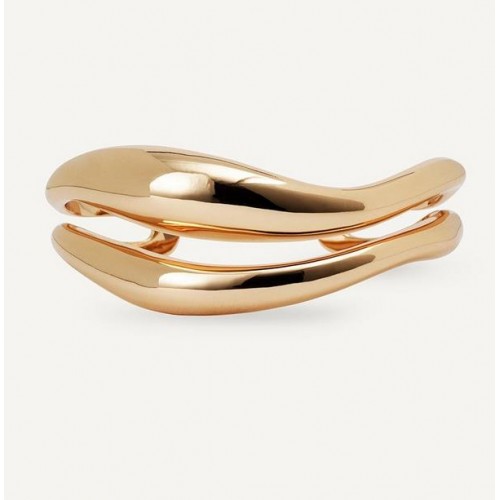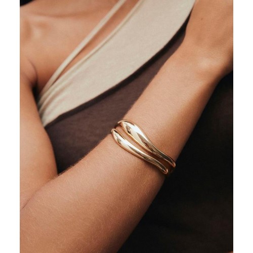 Pulseira rígida espiral de ondas chapeada com uma espessa camada de ouro maciço de 18 kt, garantindo maior durabilidade. Possui uma medida de 60 x 50 mm. Pertence à Coleção Waves, inspirada na suavidade da água, cada peça evoca uma gota em movimento que se torna uma curva que acompanha o corpo. Com acabamentos de espelho polido e um design minimalista. Lançados com a chegada de setembro, são peças versáteis que acompanham o ritmo do dia a dia, sem abrir mão do estilo.