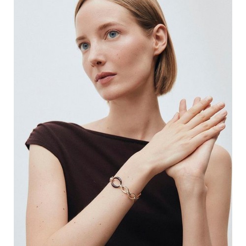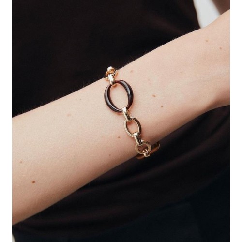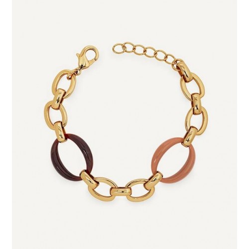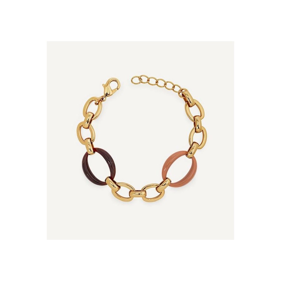 Pulseira de ligação de caramelo chapeada com uma espessa camada de ouro maciço de 18 kt, garantindo maior durabilidade. Destaca-se para o acetato e a resina em tom marrom, que proporcionam um ar de sofisticação em chave neutra. Tem um comprimento de 18 cm + 3 de corrente ajustável cm. Pertence à coleção Bold, inspirada nas tendências atuais, com jóias de grife e silhuetas renovadas para uma linha que traz cor, onde dominam os tons de camelo, marrom, caramelo e azul escuro. São peças que, sem levantar a voz, transmitem um ar seguro, confiante e determinado.