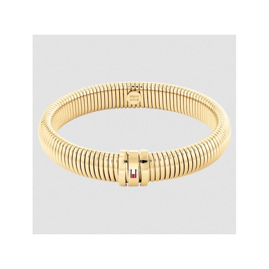 As pulseiras Tommy Hilfiger para mulher, em aço IP dourado, com pormenor da icónica bandeira da marca em esmalte, com fecho elástico, são perfeitas para utilizar sozinha ou em conjunto com outras pulseiras de diferentes cores e texturas.