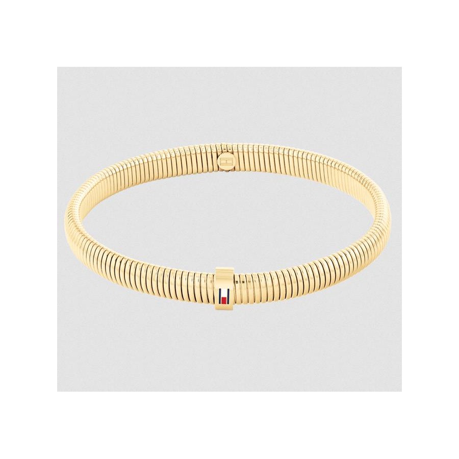 As pulseiras Tommy Hilfiger para mulher, em aço IP dourado, com pormenor da icónica bandeira da marca em esmalte, com fecho elástico, são perfeitas para utilizar sozinha ou em conjunto com outras pulseiras de diferentes cores e texturas.