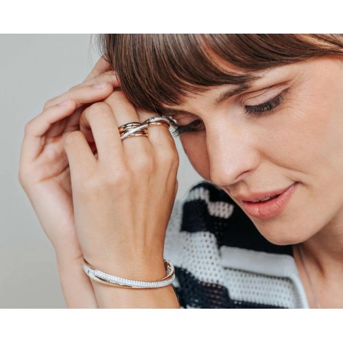 Descubra a delicadeza escultural no Anel de prata banhado a ouro TI SENTO 12343ZT. A prata esterlina 925 polida é banhada a ouro amarelo e ouro rosa, sua superfície suavemente contornada é cravejada com zircônia cúbica branca cintilante para um jogo refinado de textura. A haste afunilada mantém a silhueta leve, tornando-a ideal tanto para uso diário quanto para sofisticação após o anoitecer. Combine-o com outros anéis TI SENTO para contraste ou deixe-o brilhar sozinho como um atrativo silencioso. Hipoalergênico e sem níquel, foi projetado para oferecer conforto luxuoso do dia para a noite.