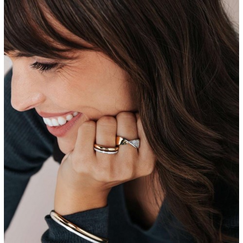 Faça uma declaração elegante com este Anel de prata banhado a ouro TI SENTO 12393ZY. Trabalhada a partir de prata 925 esterlina, este design escultural envolve o dedo em uma torção ousada: um meio banhado em ouro amarelo radiante, o outro platinado e conjunto de pavé com zircônia cúbica branca de corte brilhante. A linha diagonal entre a luz e o brilho cria uma interação dinâmica de contraste e movimento, perfeita para aqueles que favorecem o impacto refinado. Use-o sozinho como uma peça focal, ou combine-o com bandas mínimas para um visual em camadas moderna. Sem níquel e hipoalergênico, este anel traz conforto duradouro e borda polida para cada desgaste.