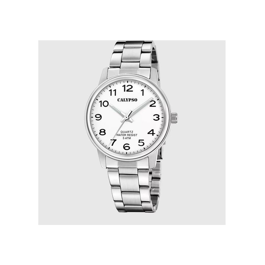 Este relógio Calypso da coleção Basic combina funcionalidade e estilo intemporal. A sua caixa redonda em aço inoxidável oferece resistência e durabilidade para uma utilização quotidiana. Equipado com um movimento de quartzo japonês Miyota, garante uma cronometragem precisa. Com vidro de cristal mineral e uma resistência à água até 5 ATM, é o companheiro ideal para a sua rotina, com a fiabilidade pela qual a Calypso é conhecida.