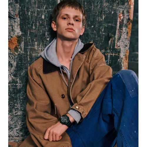 Os acabamentos minuciosos incluindo um anel da caixa com tratamento por deposição de vapor, um mostrador com padrão de raios solares e detalhes metálicos aplicados ao mostrador embutido acrescentam um toque de sofisticação ao design robusto e moderno.