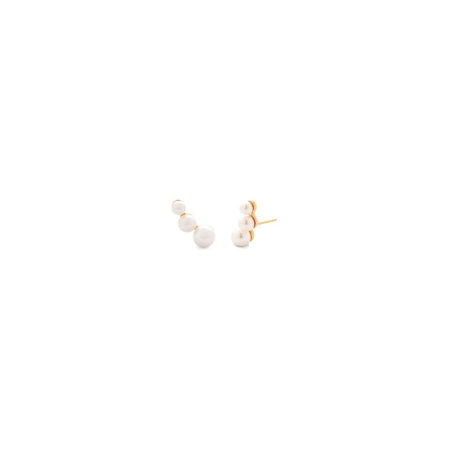 Pequenos brincos de alpinista de 1,5cm em prata esterlina banhada a ouro 18k. O design desses brincos Petit é minimalista e moderno, com três pérolas brancas redondas artesanais em tamanhos graduados de 4,5 e 6mm. Eles apresentam um fechamento push-pin.